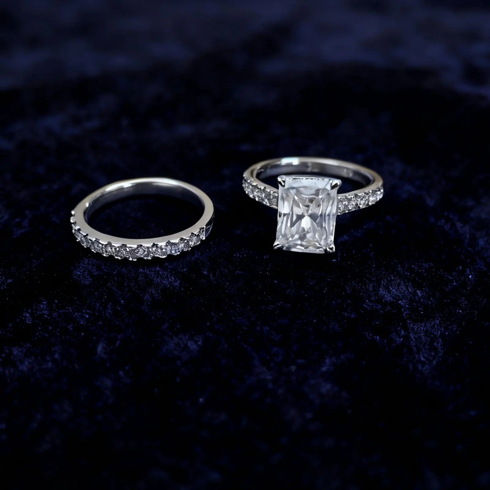 - 59 pavé moissanite stones with a radiant 7x9 mm center gem (emerald/radiant cut) catch light from every angle, elevating your everyday outfits and your special-occasion gowns.